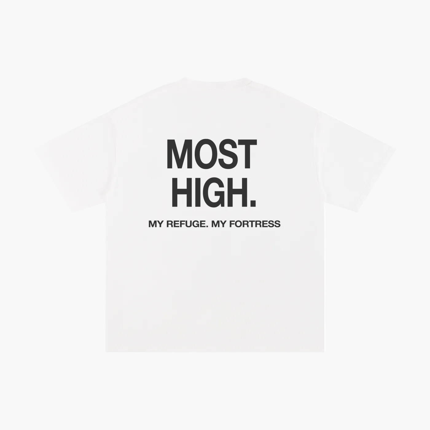 CRAFTED FROM MIDWEIGHT 230 GSM COTTON JERSEY, THE MY REFUGE AND FORTRESS T-SHIRT FEATURES DROPPED SHOULDERS AND A LOOSE FIT FOR A RELAXED, MODERN SILHOUETTE. THE T-SHIRT IS FINISHED WITH THE “MOST HIGH. MY REFUGE. MY FORTRESS.” GRAPHIC PRINTED AT THE BACK, INSPIRED BY PSALM 91.