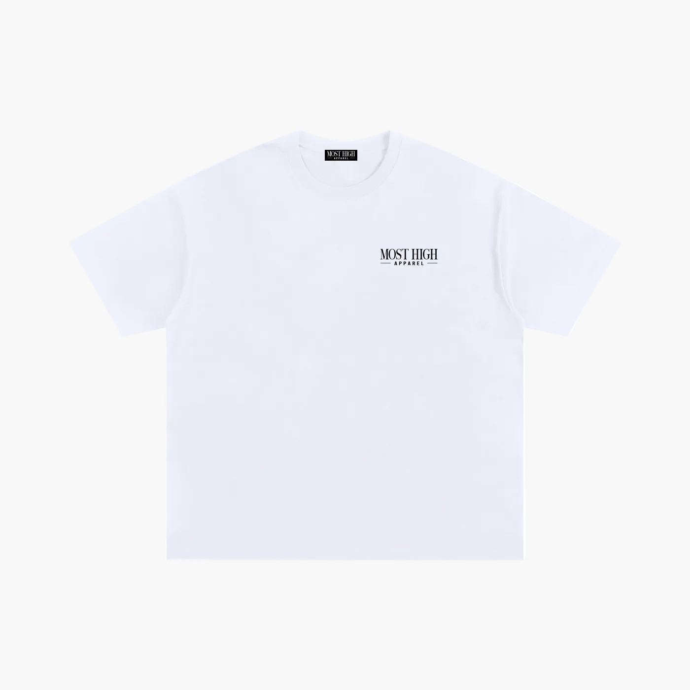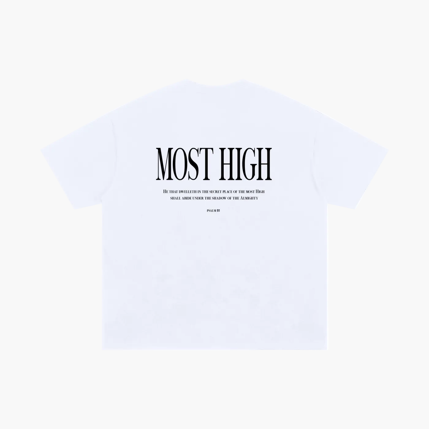 THE BACK GRAPHIC FEATURES “MOST HIGH” ALONGSIDE A PASSAGE FROM PSALM 91, ONE OF THE MOST WELL-KNOWN SCRIPTURES OF PROTECTION AND FAITH. THE MINIMAL FRONT AND BOLD BACK PRINT CREATE A CLEAN, MODERN DESIGN THAT BALANCES MESSAGE AND STYLE.